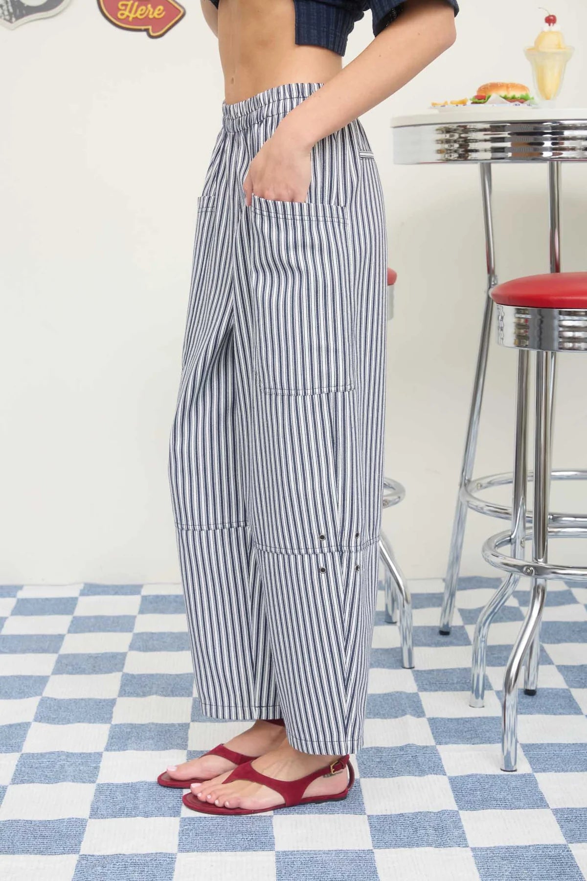 Effortlessly chic and undeniably comfy, the "Kim" Stripe Wide Leg Pants deliver that perfect balance of style and ease. Cut in a flattering mid-rise silhouette with an elastic waist, these navy beauties feature functional front patch pockets—because real pockets matter. A subtle grommet detail adds just the right touch of personality to keep things playful. Slip them on and feel the difference quality construction makes.