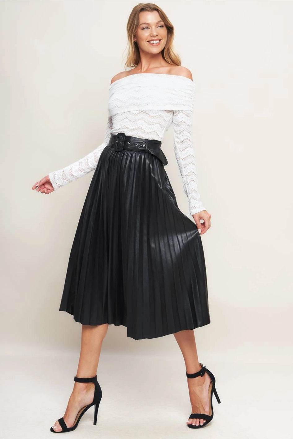 The "Lilah" Faux Leather Skirt delivers sophisticated edge with its structured pleated design and sleek black faux leather construction. The integrated self belt with buckle detail creates a polished silhouette that cinches at the waist for a flattering fit. Versatile enough for elevated casual wear or dressed-up occasions, this piece transitions seamlessly from day to evening.