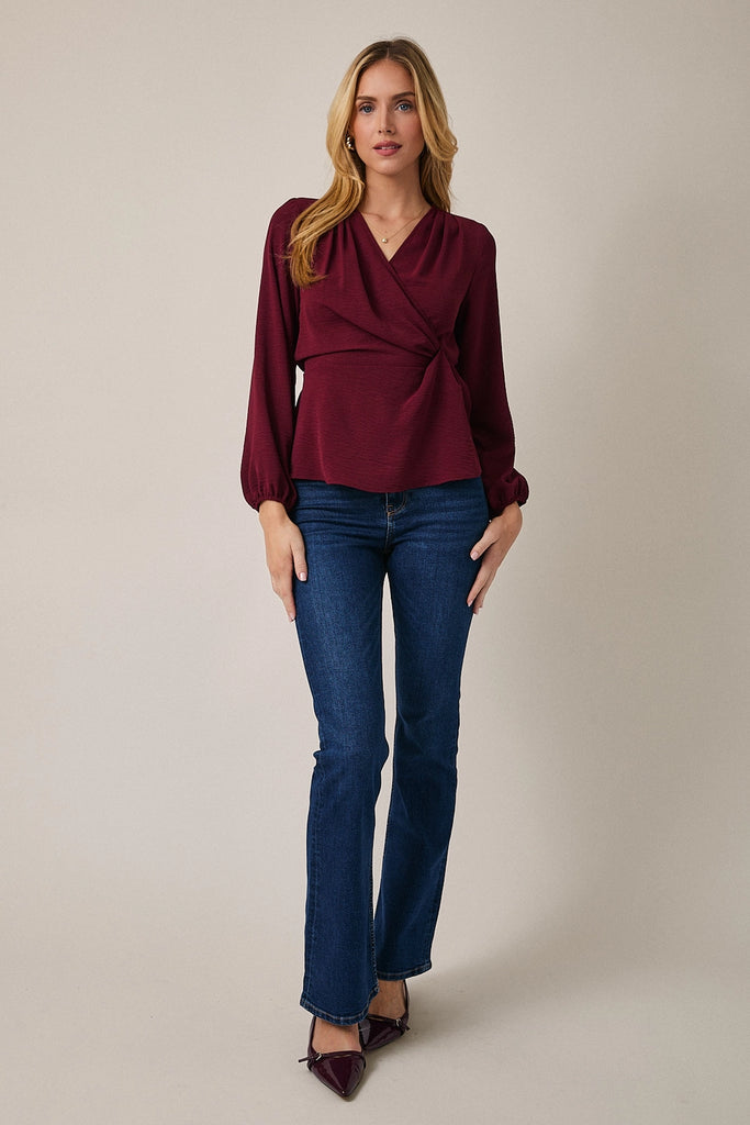 Add a splash of fun to your wardrobe with the "Mia" blouse in a rich wine shade. Featuring a flattering long-sleeve surplice twist top, it effortlessly blends elegance with a playful vibe.