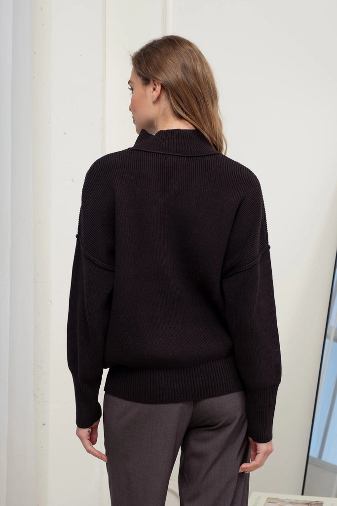 Stay cozy and chic in the "Nora" Ribbed Sweater! This black beauty features a trendy mock neck and extended shoulders for an effortlessly cool vibe. Ribbed cuffs keep the warmth in, while the exposed seams add a playful, edgy touch. Perfect for layering or wearing solo, Nora brings comfort and style together with a wink.