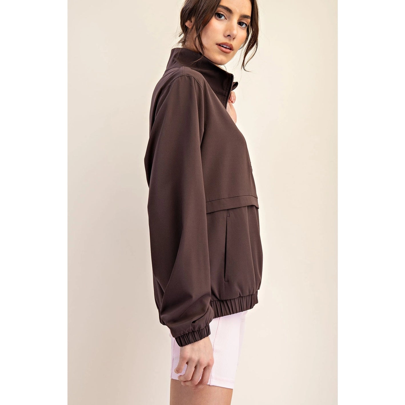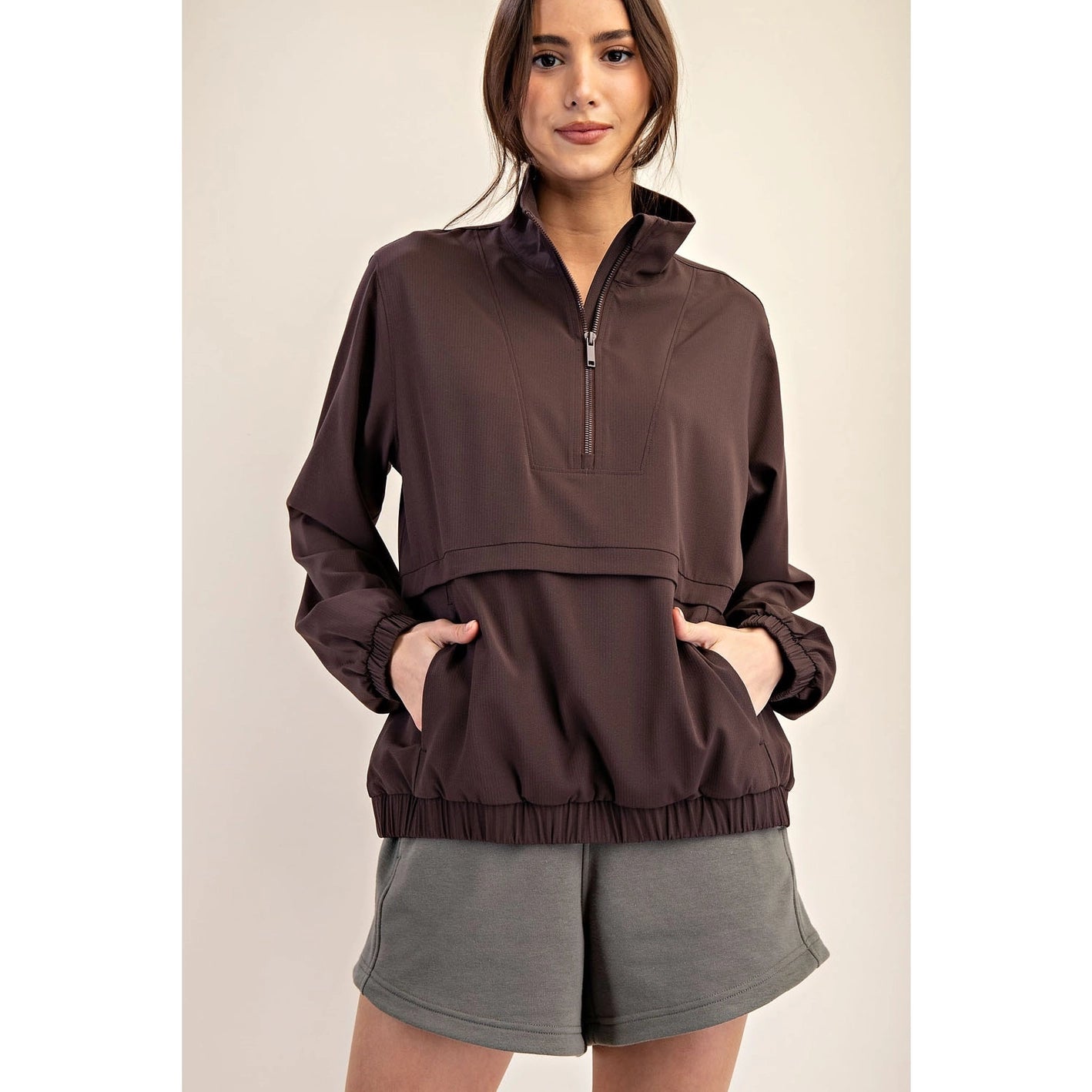 Wrap yourself in cozy vibes with the "Heather" Quarter Zip Jacket, your new go-to layer for effortless style. Crafted from textured crinkle woven fabric in a rich espresso tone, this jacket features a relaxed standard fit that works with everything in your closet. The mock neck and quarter zip give you easy temperature control, while long sleeves keep you warm and covered.