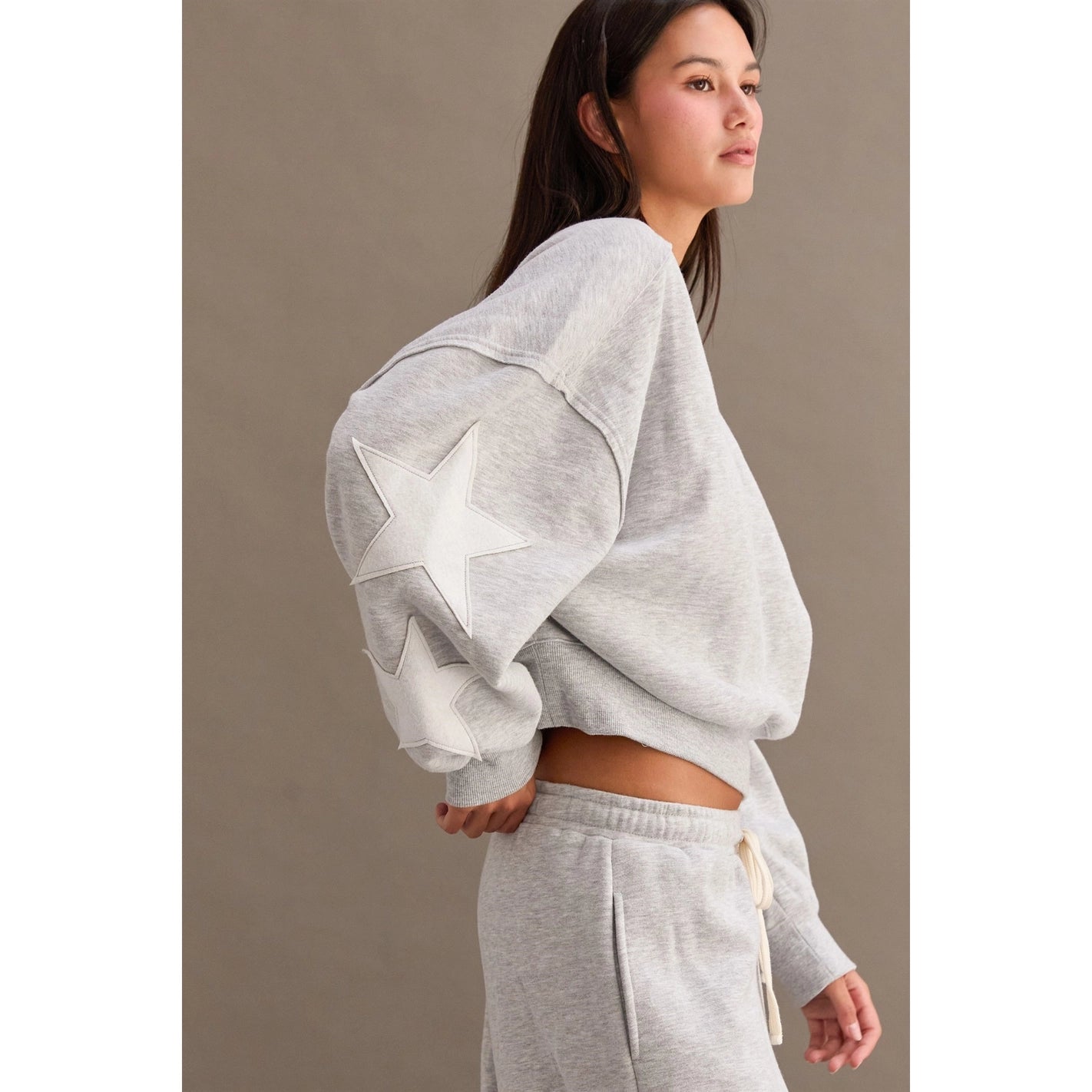This heather gray Star Patch Crewneck Sweatshirt combines classic comfort with subtle style. Crafted from soft, durable fabric, it offers a cozy fit ideal for everyday wear. The distinctive star patch adds a refined, expert touch, making it a versatile piece that elevates casual outfits with understated detail.