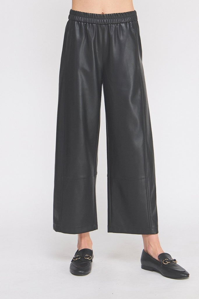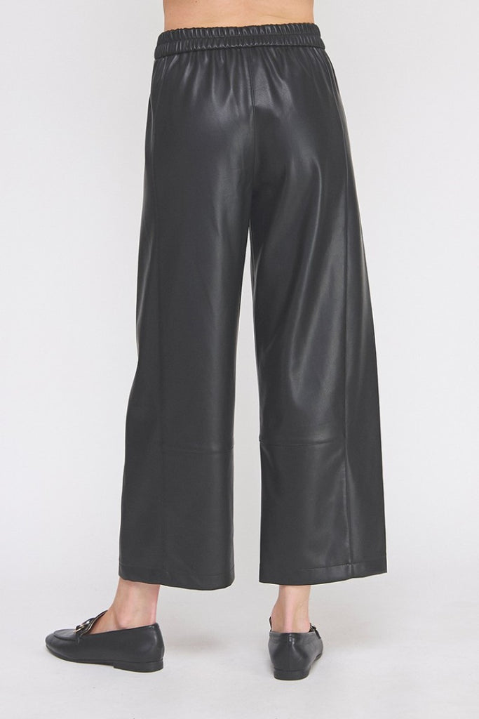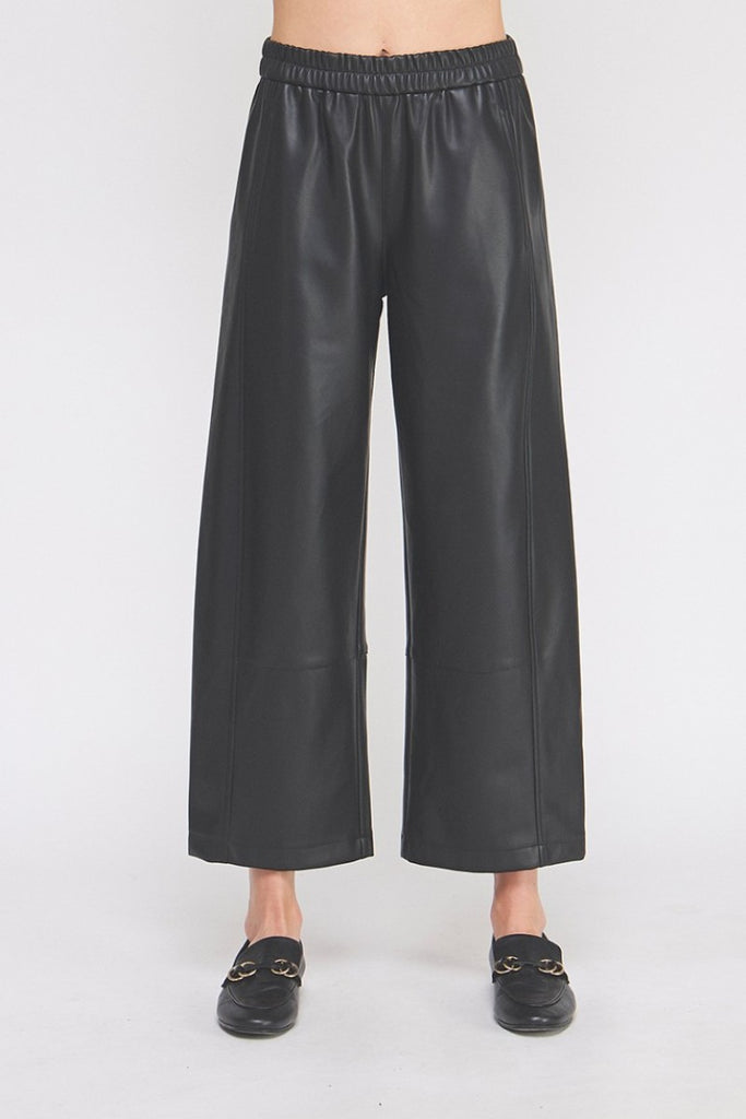 Step into style with the "Lucy" Vegan Leather Pants in a warm caramel shade. These pants feature a comfy elastic waist and a wide ankle cut, perfect for effortless movement and all-day comfort. Seamed details add a trendy edge, making them ideal for anyone who loves fashion with a fun twist. Pair them with your favorite top for a look that’s both chic and playful.