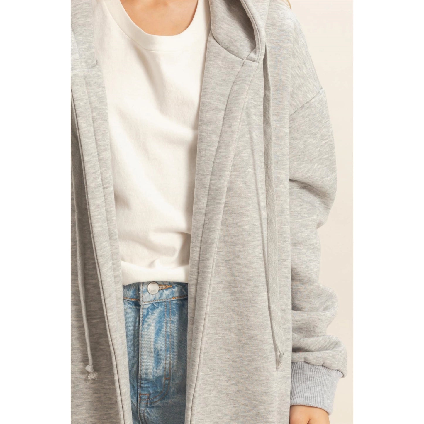 Stay cozy and chic in the "Taylor" Fleece Coat! This heather gray longline beauty wraps you in soft warmth while the hood with a drawstring keeps things snug and stylish. With trendy drop shoulders, playful cinched cuffs, and an easy open-front design, it’s your perfect go-to for layering up in comfort and flair.