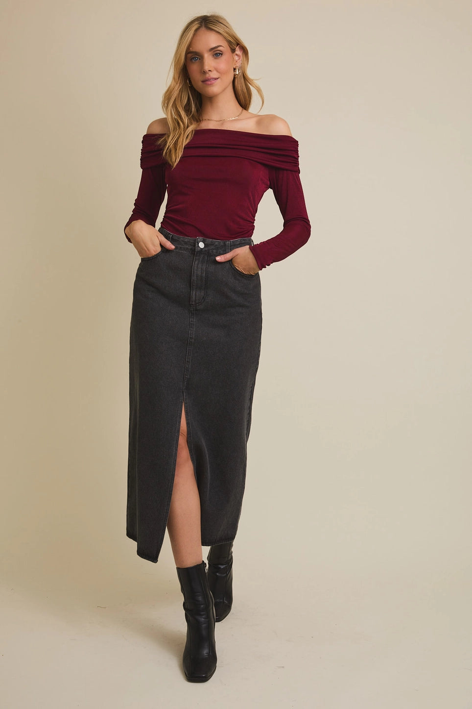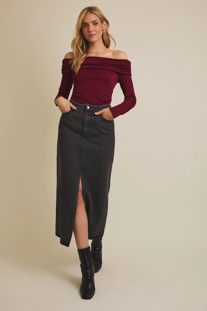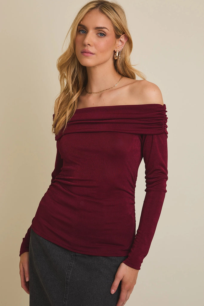 Add a splash of charm to your wardrobe with the "Luna" Off Shoulder Top. This playful burgundy piece features long sleeves and a flattering off-shoulder design that adds a flirty touch to any look. Perfect for dressing up or keeping it casual, it brings effortless style and a comfortable fit to your day.