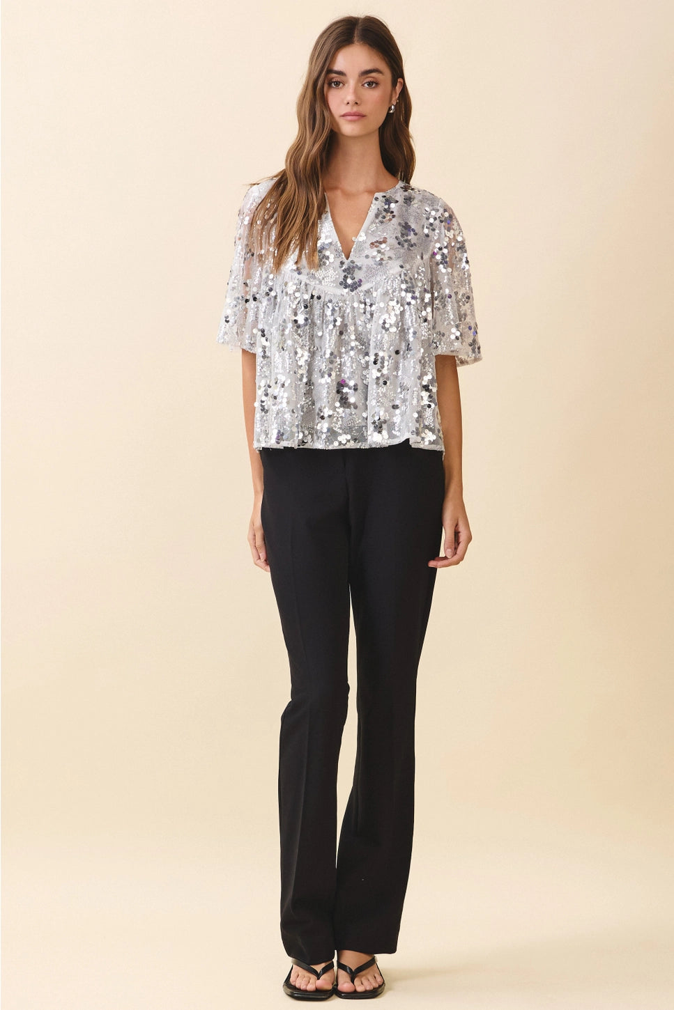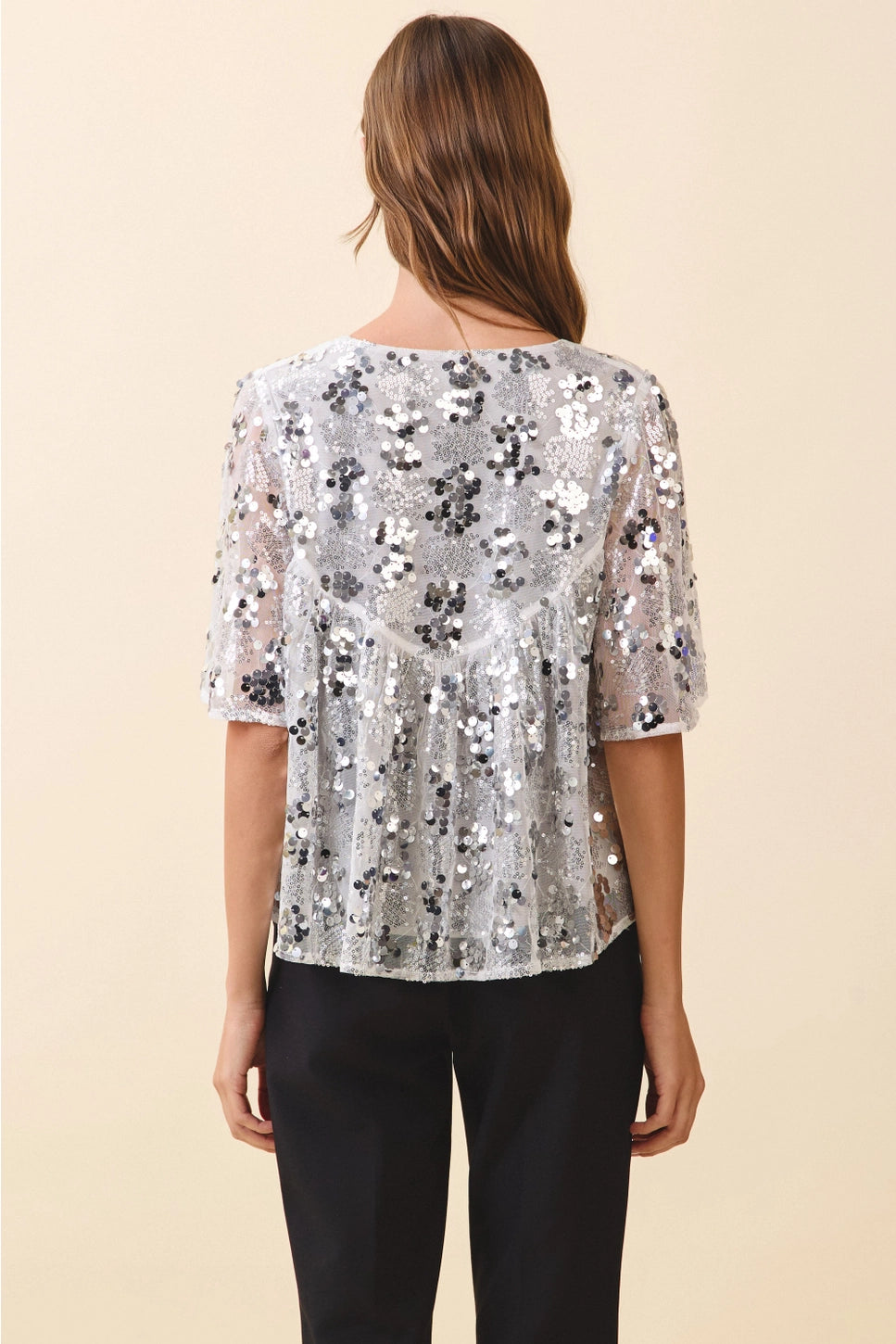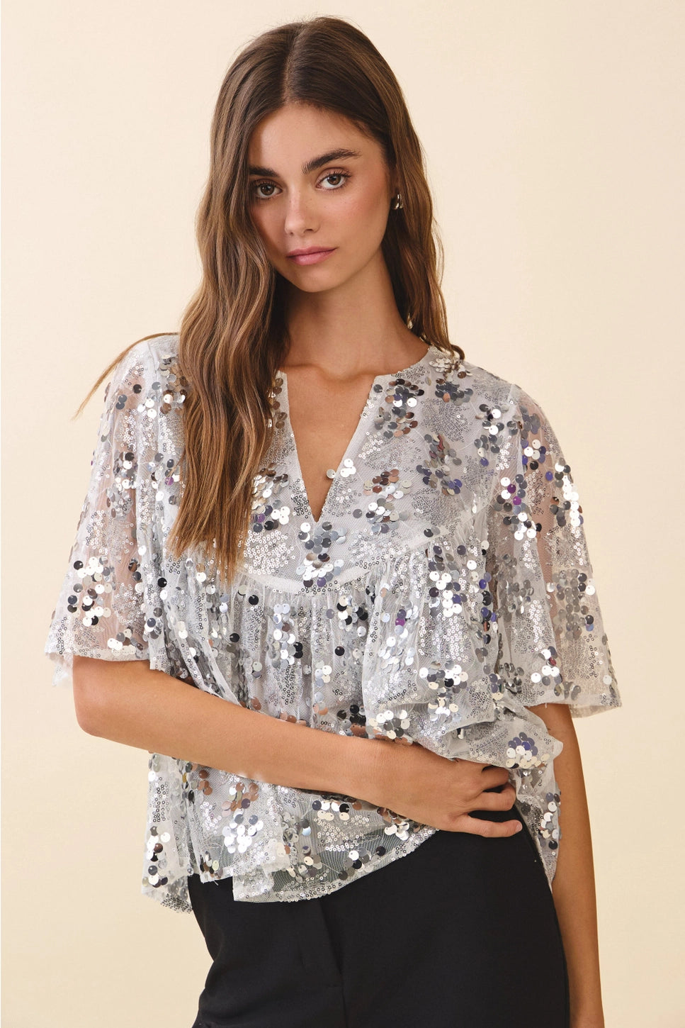 Elevate your evening wardrobe with the "Raquel" Sequin Top, a sophisticated piece that commands attention. Crafted from sheer mesh adorned with silver sequins, this top delivers an all-over luminous shimmer perfect for special occasions.