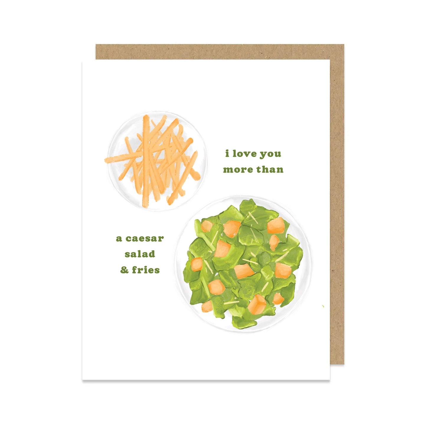 Celebrate your love with this charming greeting card featuring the playful message "I love you more than a caesar salad & fries." Perfect for food lovers and those with a quirky sense of humor, this card brings a smile to any occasion. Each card arrives in a coordinating envelope, ready to send to that special someone who appreciates both romance and comfort food. A delightful way to express affection with a dash of personality.