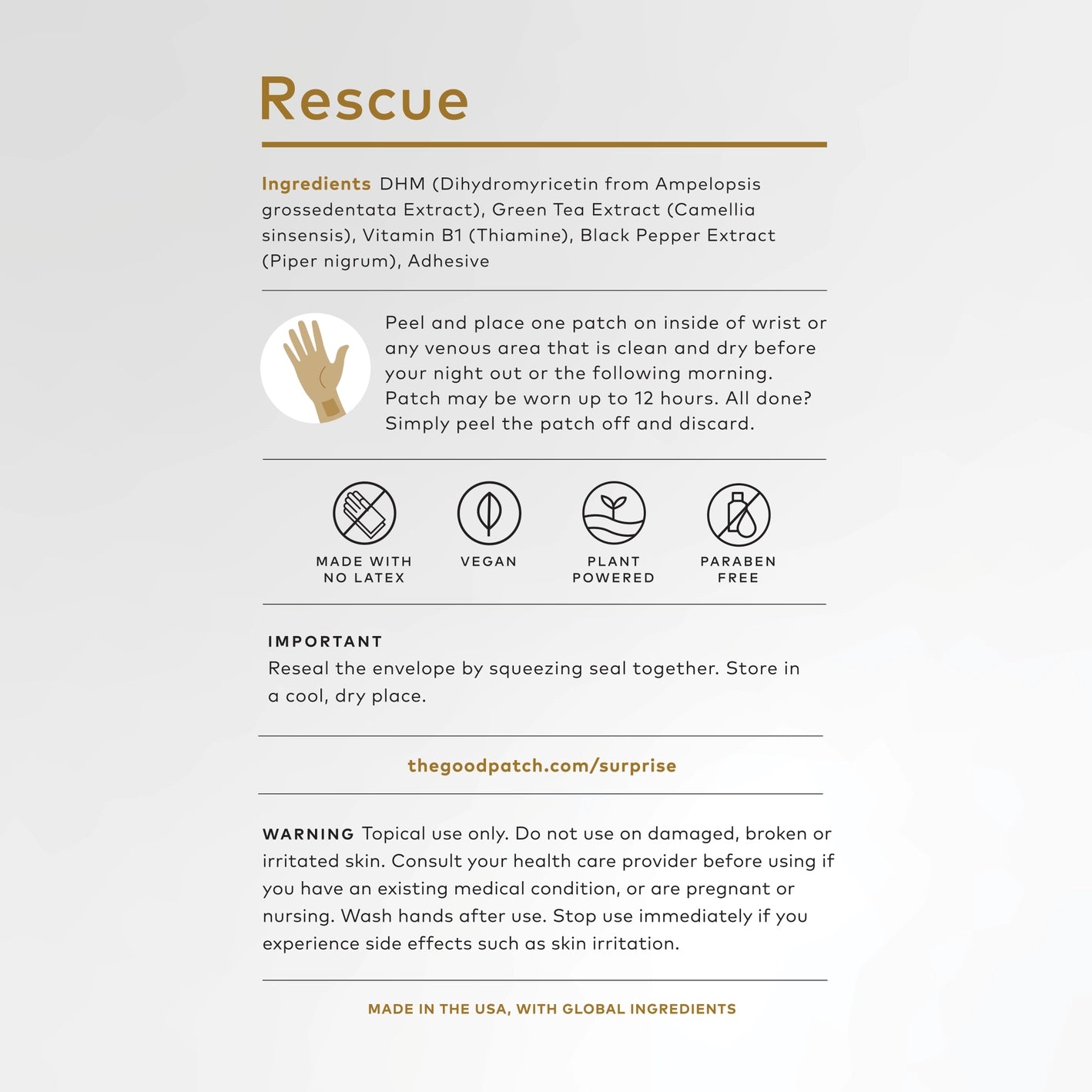 The Limited Edition Rescue patch is here to help you bounce back after the big night out! Celebrate in style with these limited-time only white & gold patches. Stick a patch on before the fun begins or after it ends!
