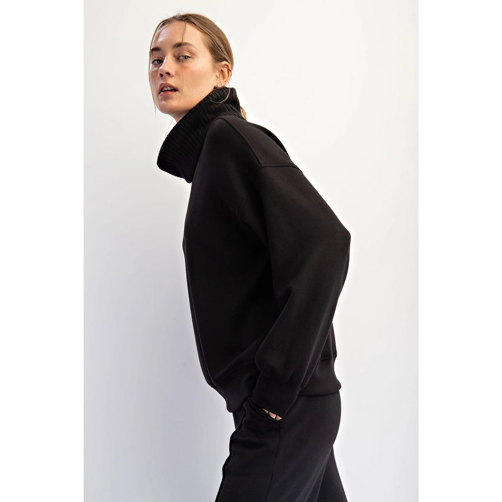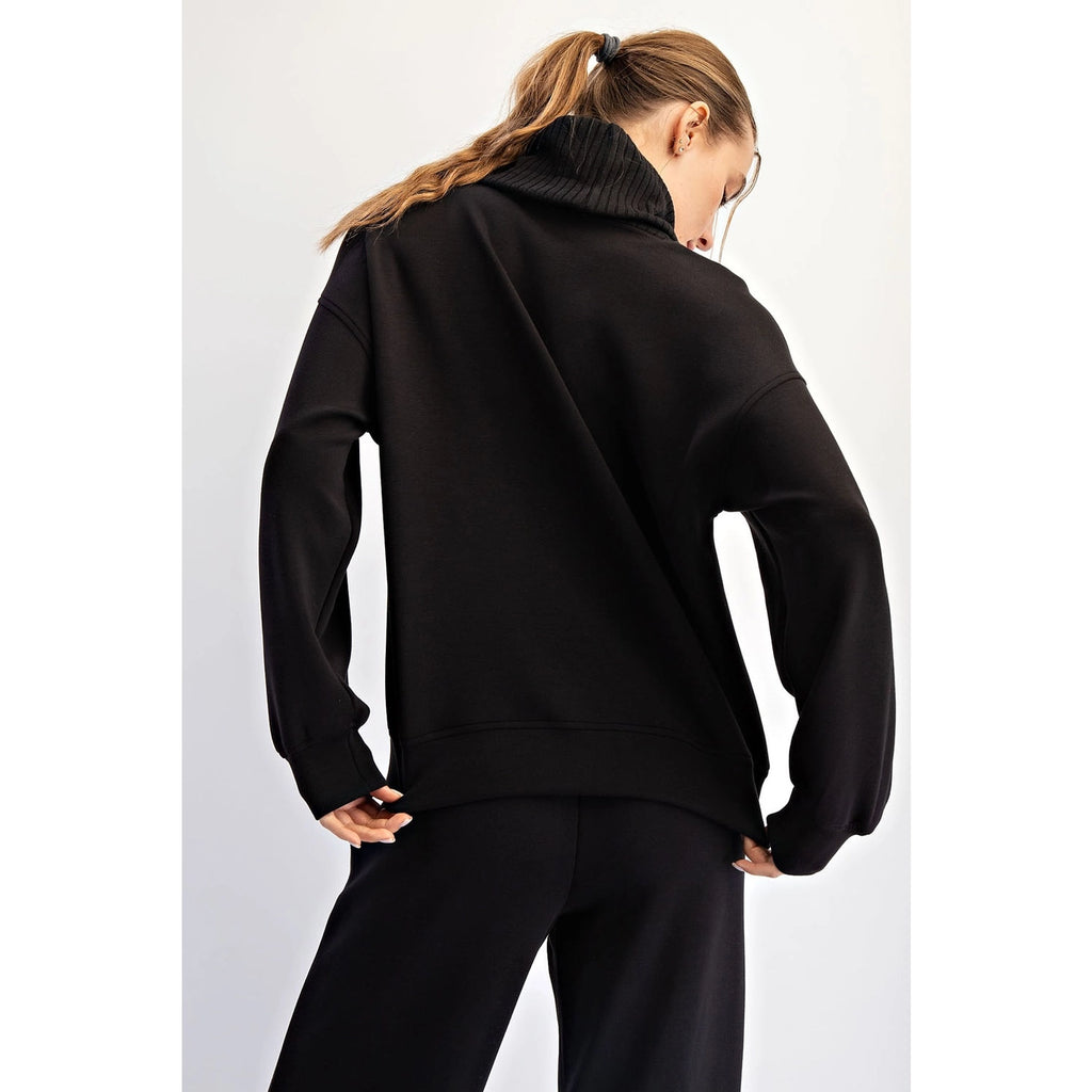 This black long sleeve top showcases premium modal poly span scuba fabric engineered for comfort and durability. The silky-smooth composition feels remarkably lightweight, making it ideal for layering or standalone wear.