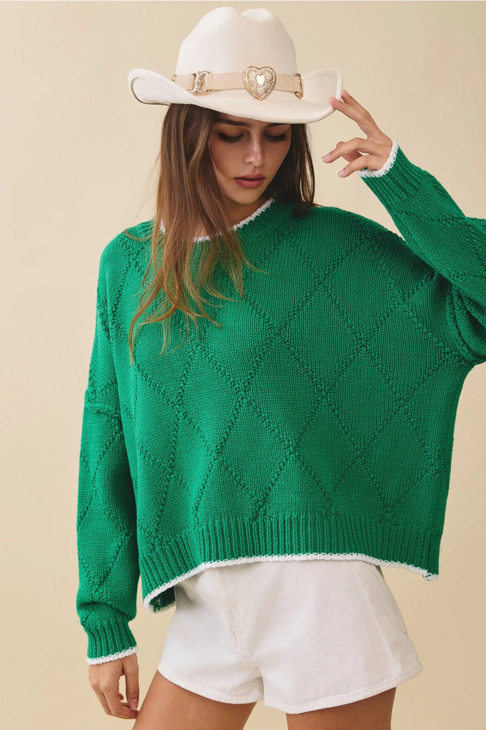 Wrap yourself in cozy elegance with the "Carrie" Diamond Knit Sweater. This charming pullover features a timeless diamond knit pattern that adds visual interest to any outfit. Crafted in a fresh green hue, it's the perfect layering piece for transitional weather or casual styling. The soft, breathable fabric keeps you comfortable all day long, while the classic silhouette works beautifully with jeans, skirts, or trousers. \