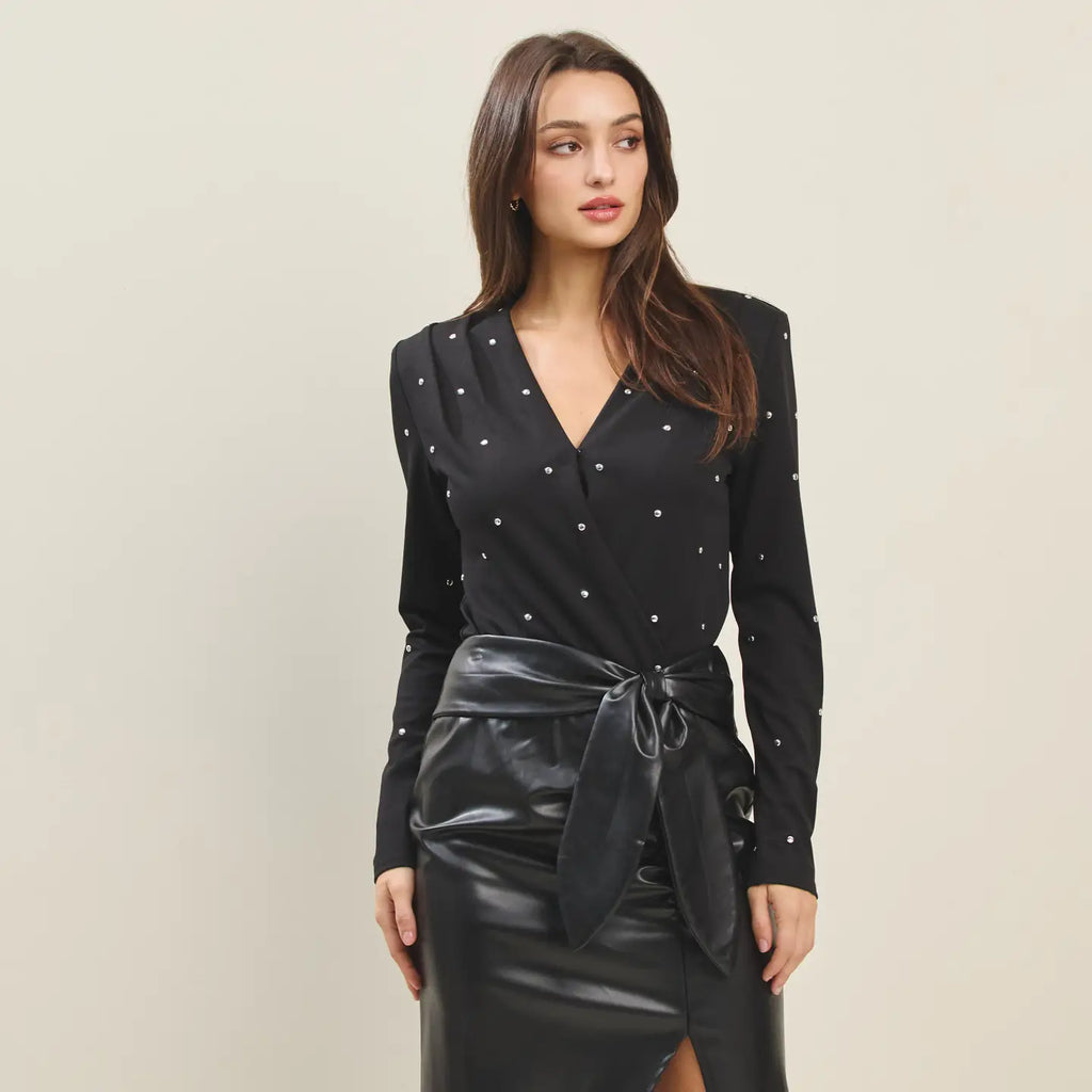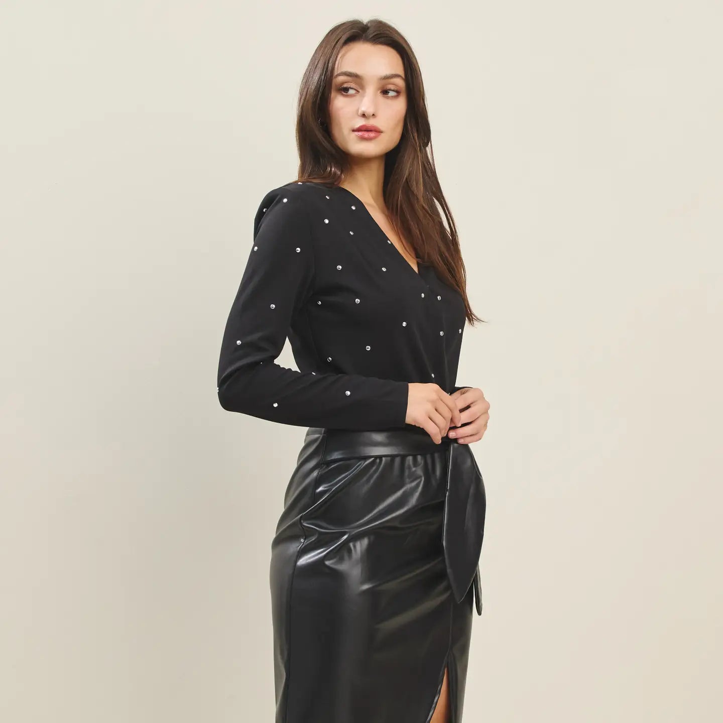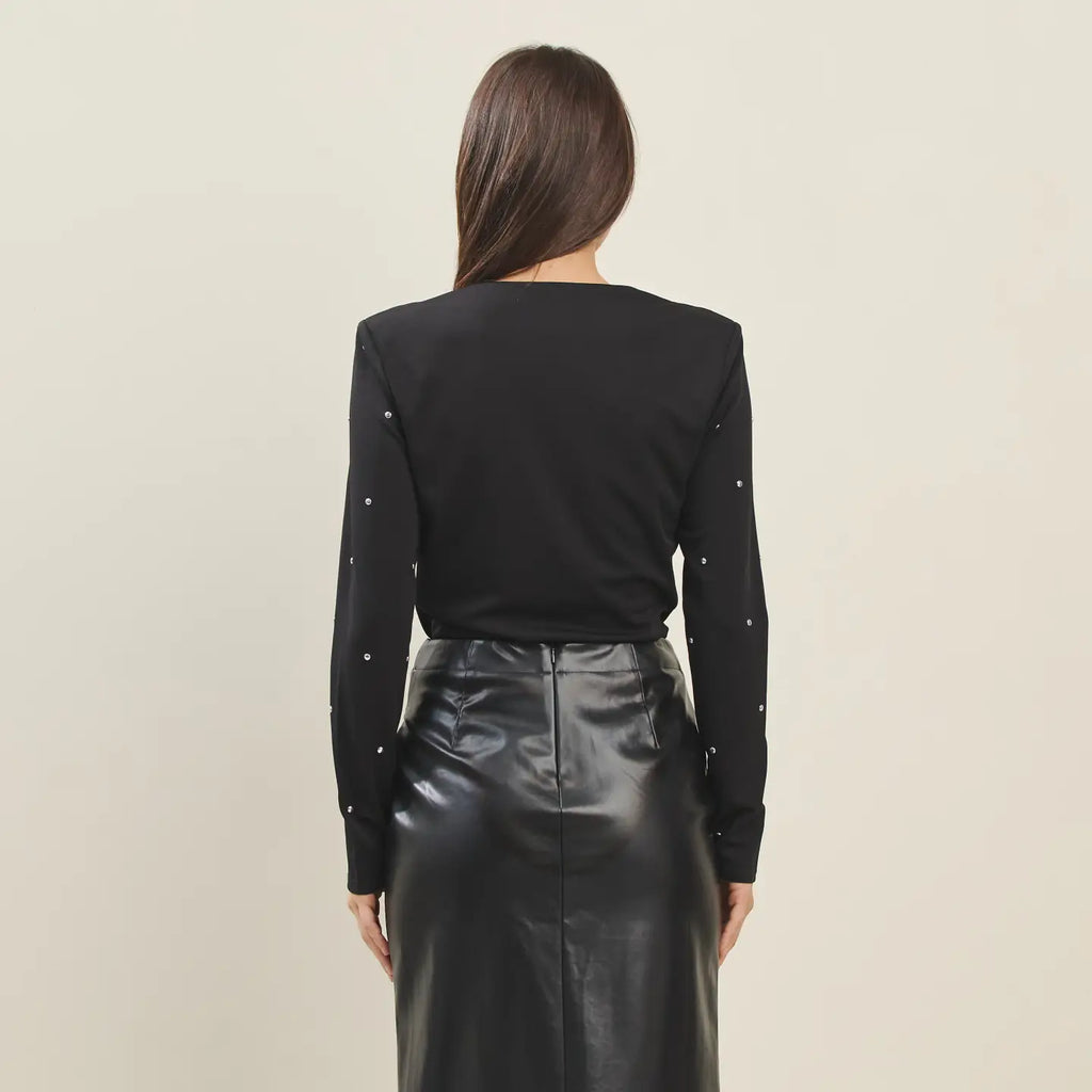 Elevate your style with the "Charlotte" Studded Bodysuit—a sleek, black long-sleeve essential that hugs your curves with stretchy comfort. Its V-neckline and embellished top add just the right amount of sparkle, making it perfect for turning heads day or night.