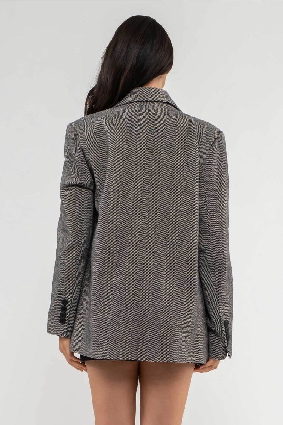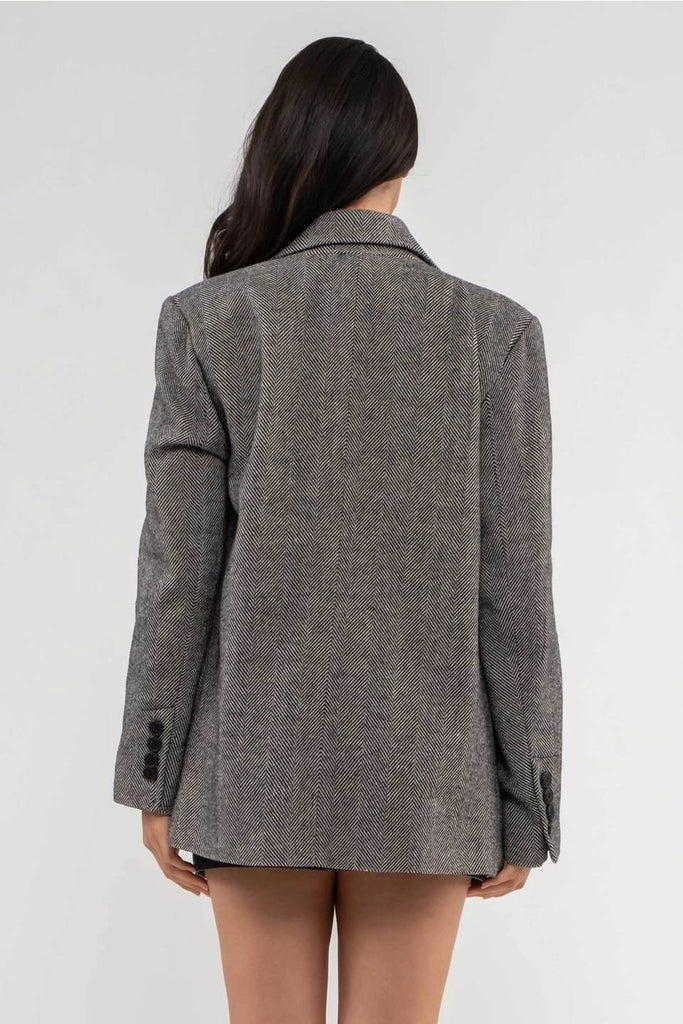 Meet the "Kat" Oversized Blazer—a playful twist on classic style. Featuring a notch collar and long sleeves with buttoned cuffs, it combines comfort with charm. The long line cut and chevron plaid pattern in chic grey make it perfect for layering any outfit. Little details like mock pocket tabs and button accents add a fun, unique touch to your wardrobe.