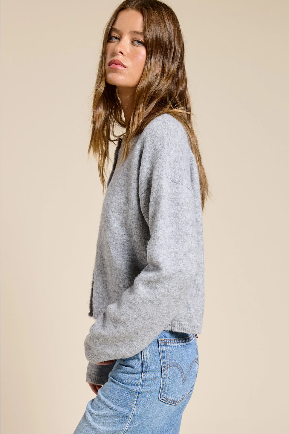 Cut with a relaxed, slightly cropped silhouette, dropped shoulders, and ribbed trim, it's the perfect layer for casual styling. Button up front and round neckline complete the effortless look.