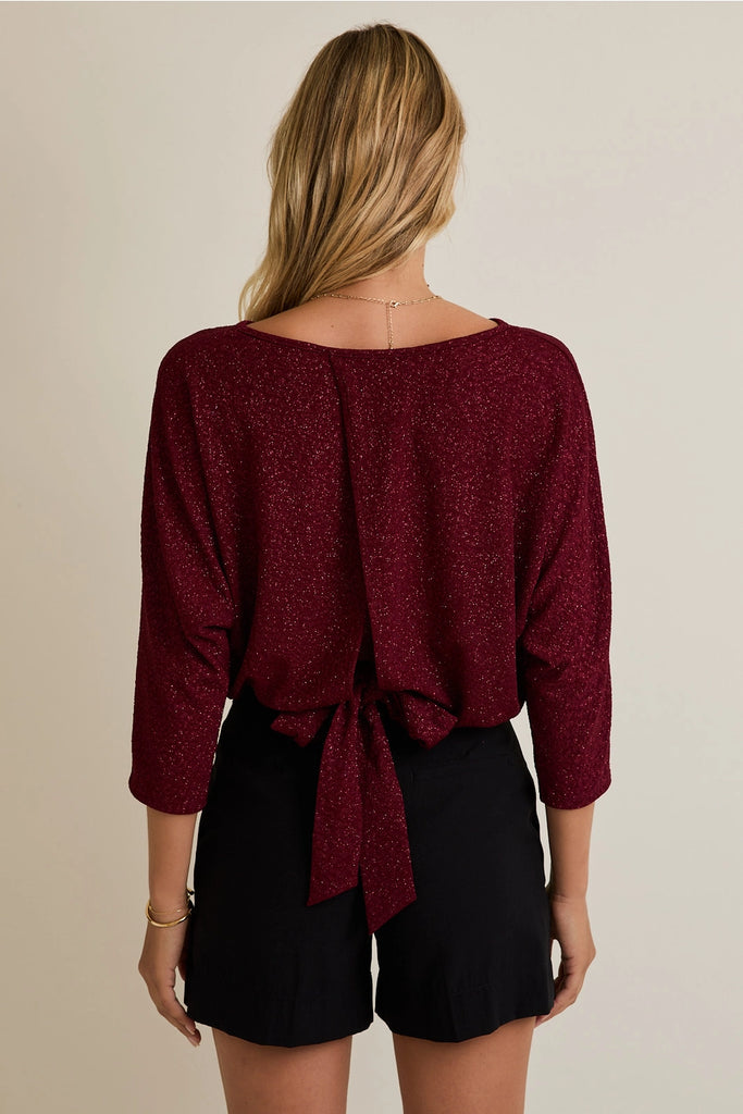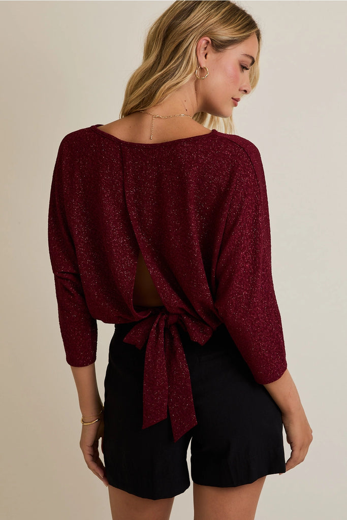 Elevate your wardrobe with the "Taylor" Shimmer Top, featuring a rich burgundy hue and a striking back-open design secured with elegant tie details. Crafted with subtle lurex threads, this long-sleeve top adds a refined shimmer while maintaining comfort. Perfect for sophisticated evening looks, it combines style and allure with expert tailoring for a flattering fit.