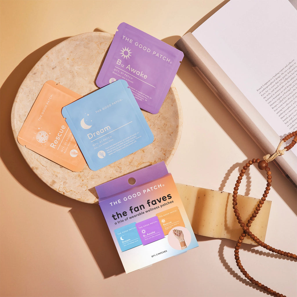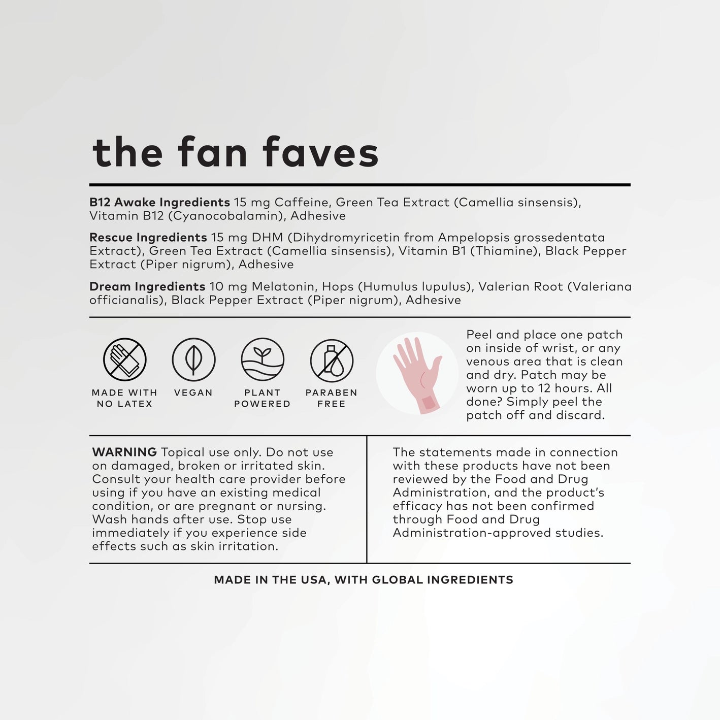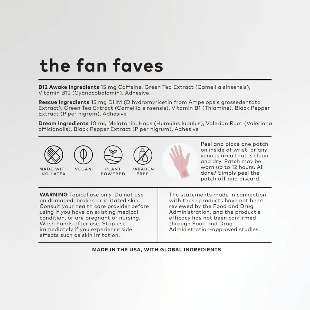 A plant-powered wearable wellness patch set for on-the-go wellness. The Fan Faves Set includes 1 B12 Awake patch, 1 Dream patch, and 1 Rescue patch, for 3 patches total. This patch sampler trio is the ultimate travel companion or stocking stuffer for the holiday season!