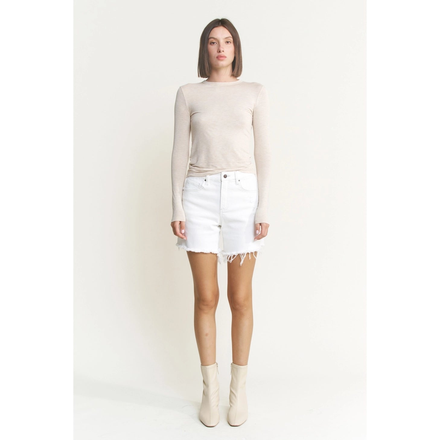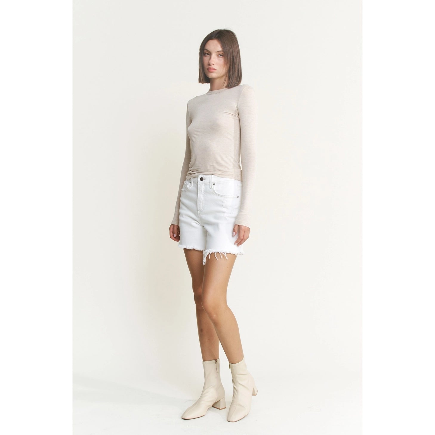 Crisp white denim shorts with a flattering high-rise cut and intentional distressing at the thighs. Frayed hem detail adds effortless boho edge while the structured fit provides all-day comfort. Perfect for warm-weather styling—dress up with a silk blouse or keep it casual with a fitted tee. A versatile wardrobe essential that transitions seamlessly from day to night.