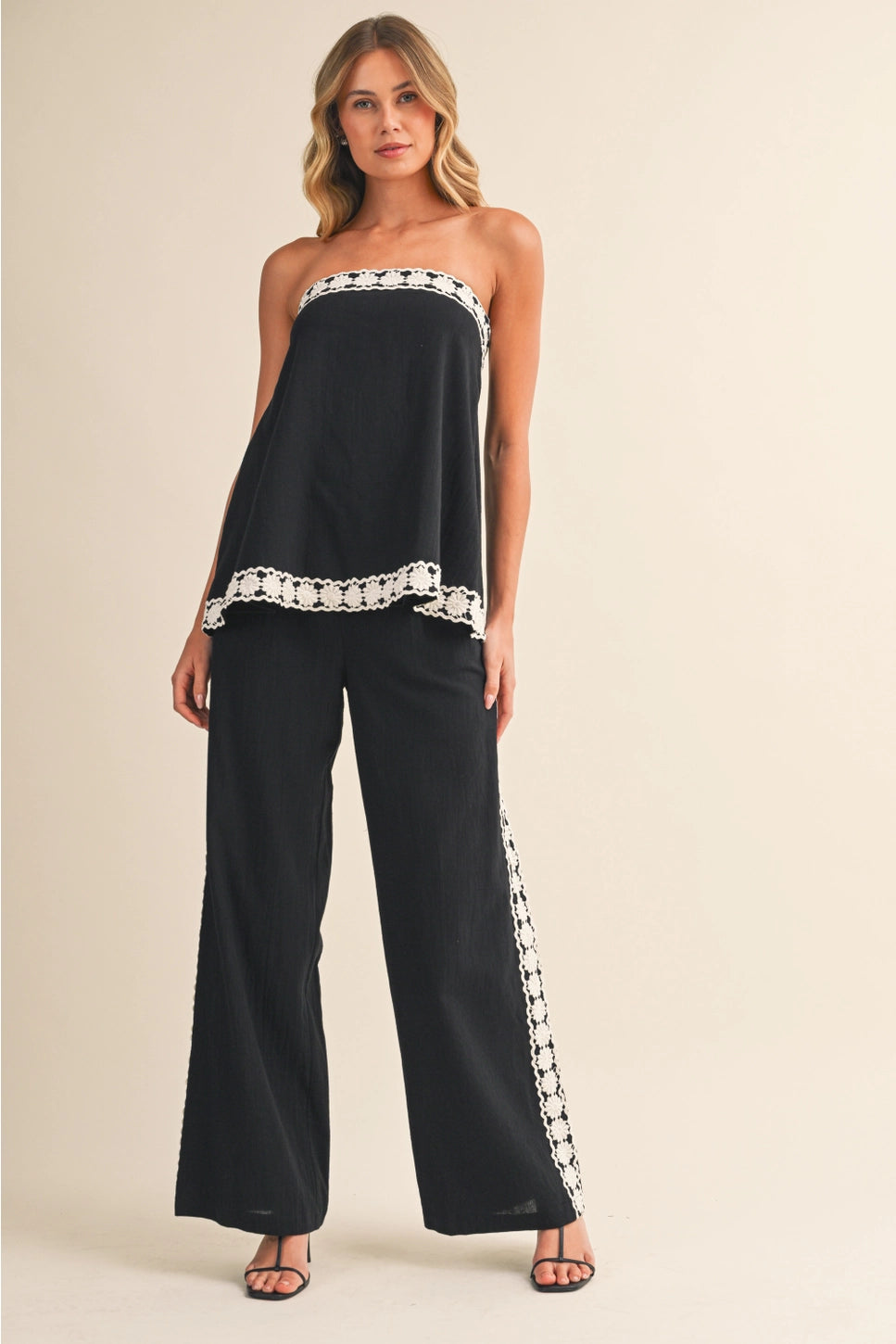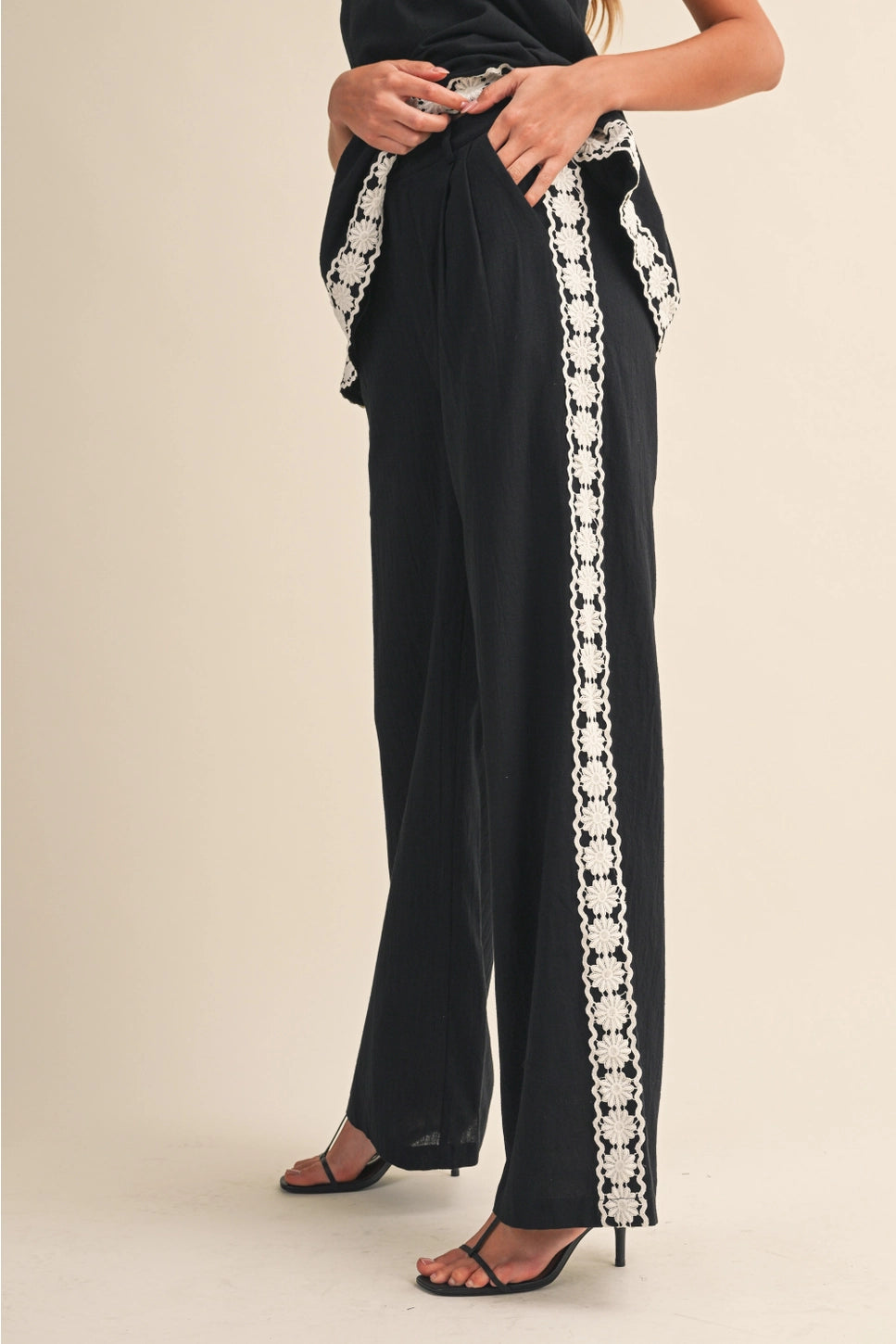 Elevate your everyday style with these sophisticated black lace edge pants. Featuring delicate lace detailing along the side, they blend timeless elegance with modern edge. The sleek black silhouette pairs effortlessly with everything from casual tees to polished blouses, making them a versatile wardrobe essential. Perfect for transitioning from day to night with understated glamour.