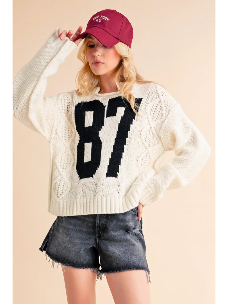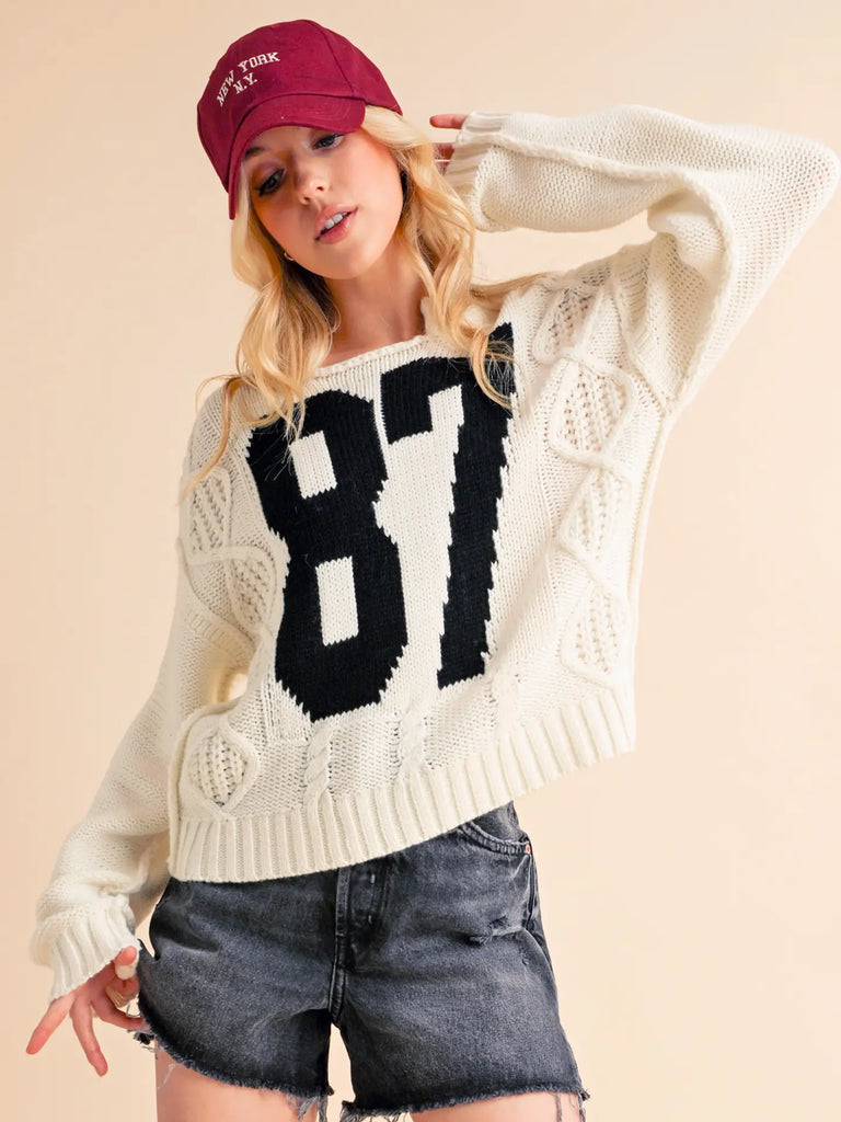 Cozy up in the 87 Sweater! This soft, cable knit pullover boasts a relaxed, slouchy fit with trendy drop-shoulder sleeves. The oversized contrasting number on the front adds a bold pop of personality, while exposed seam details give it an effortless edge.