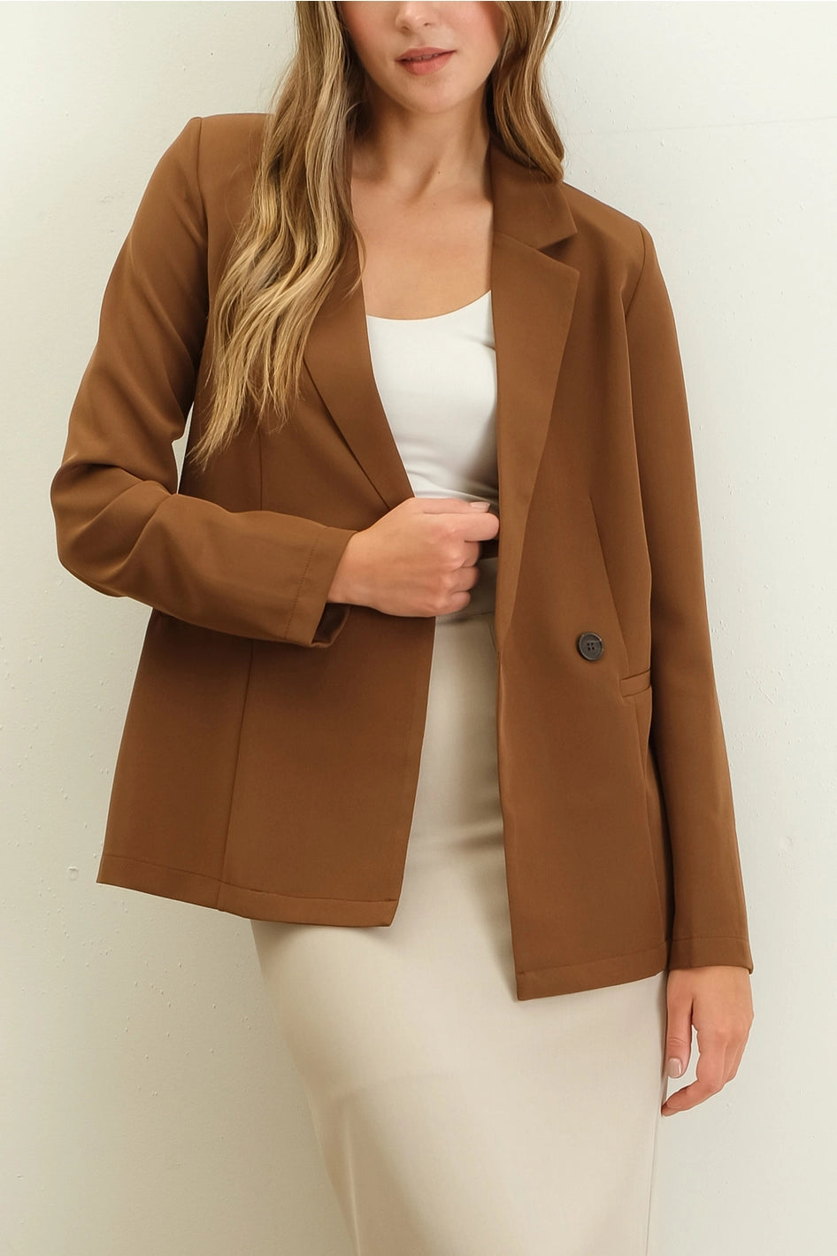The "Gracie" blazer features a sophisticated double-breasted design with a classic collar and button-down front, crafted from 100% polyester for durability and easy care. Its rich brown color complements professional and casual looks alike, offering a polished silhouette that enhances any wardrobe with refined structure and timeless style.