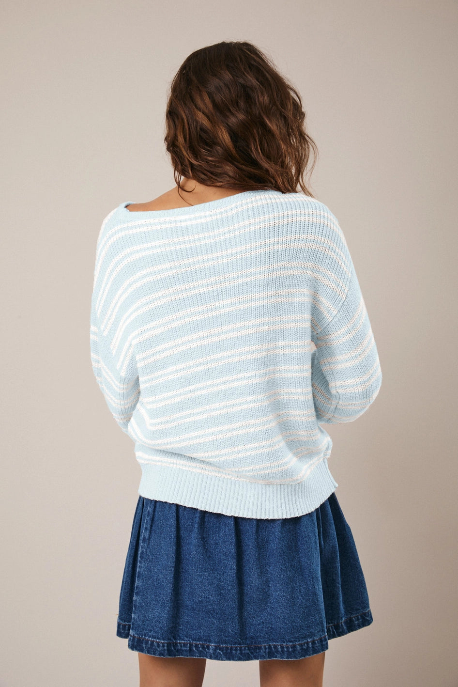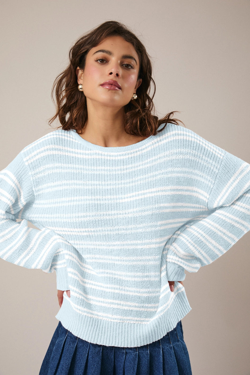 Effortlessly chic and undeniably cozy, the "Lexi" Boat Neck Sweater brings timeless nautical vibes to your everyday rotation. Featuring crisp light blue and white stripes with a flattering boat neckline and long sleeves, this versatile piece transitions seamlessly from casual coffee dates to relaxed weekend getaways.