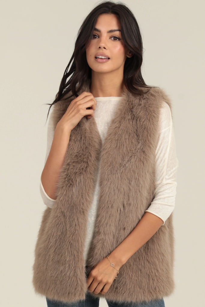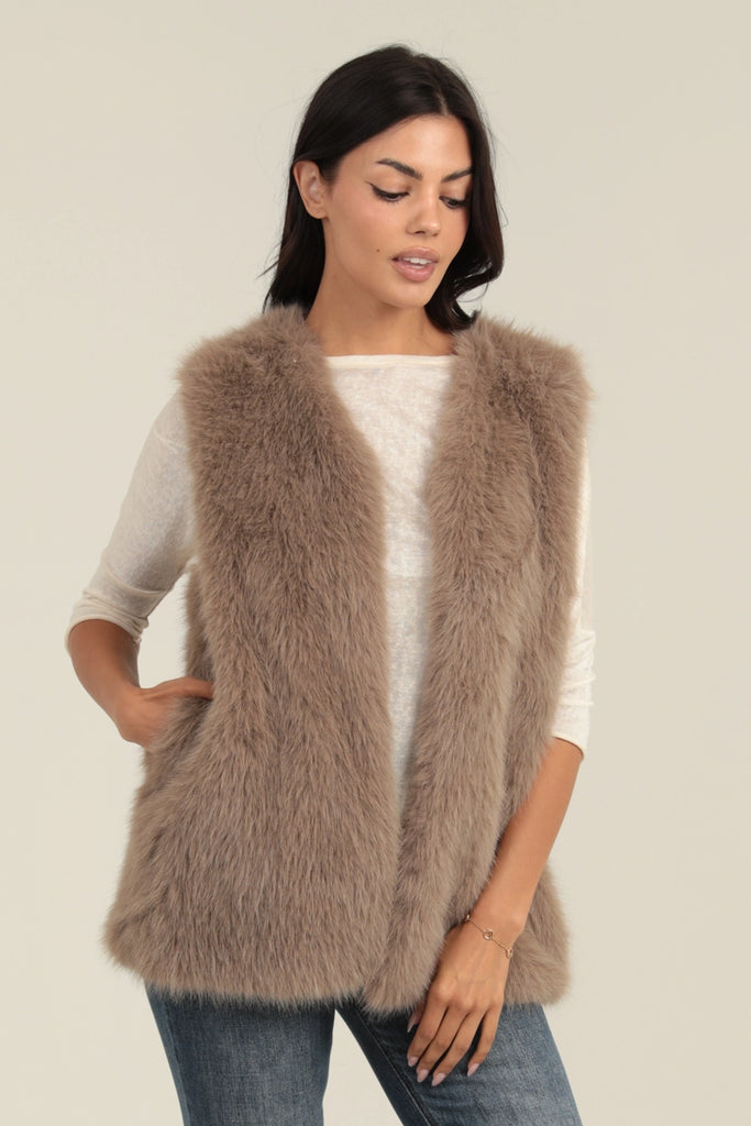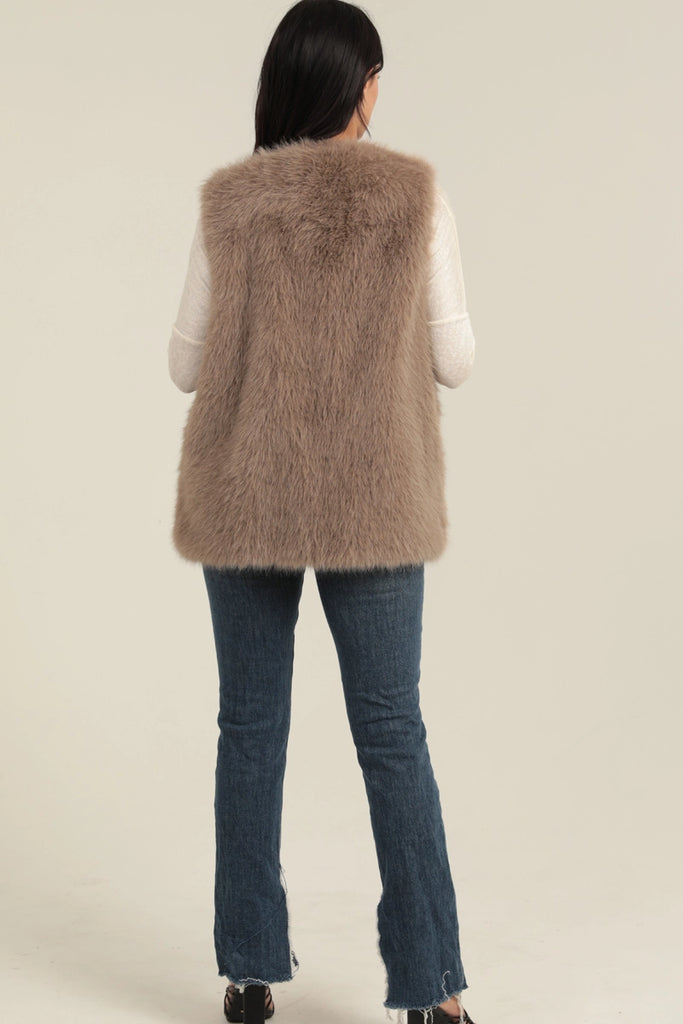 Wrap yourself in cozy charm with the "Annabelle" Faux Fur Vest in a versatile taupe shade. Soft, plush texture meets practical style with handy pockets to stash your essentials. Perfect for layering, this vest adds a touch of playful luxury to any outfit while keeping you snug and chic.
